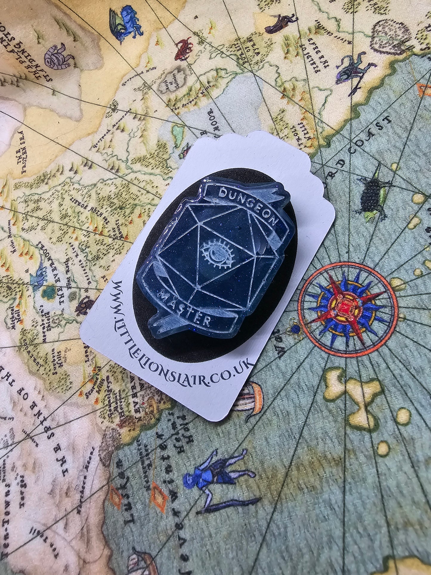 Unleash your inner master with this dark blue Dungeon master pin badge. Perfect for players, game masters, and anyone who loves to delve into the depths of a good game. Show off your skills (and style) with this unique addition to your collection.