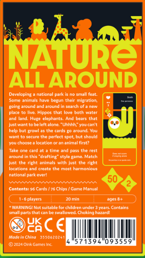 Some animals have begun their migration, going around and around in search of a new place to live. Hippos that love both water and land. Huge elephants. And bears that just want to be left alone. "Uhhhh," you can't help but growl as the cards go around. You want to secure the perfect spot, but should you choose a location or an animal first? Take one card at a time and pass the rest around in this "drafting" style game.
