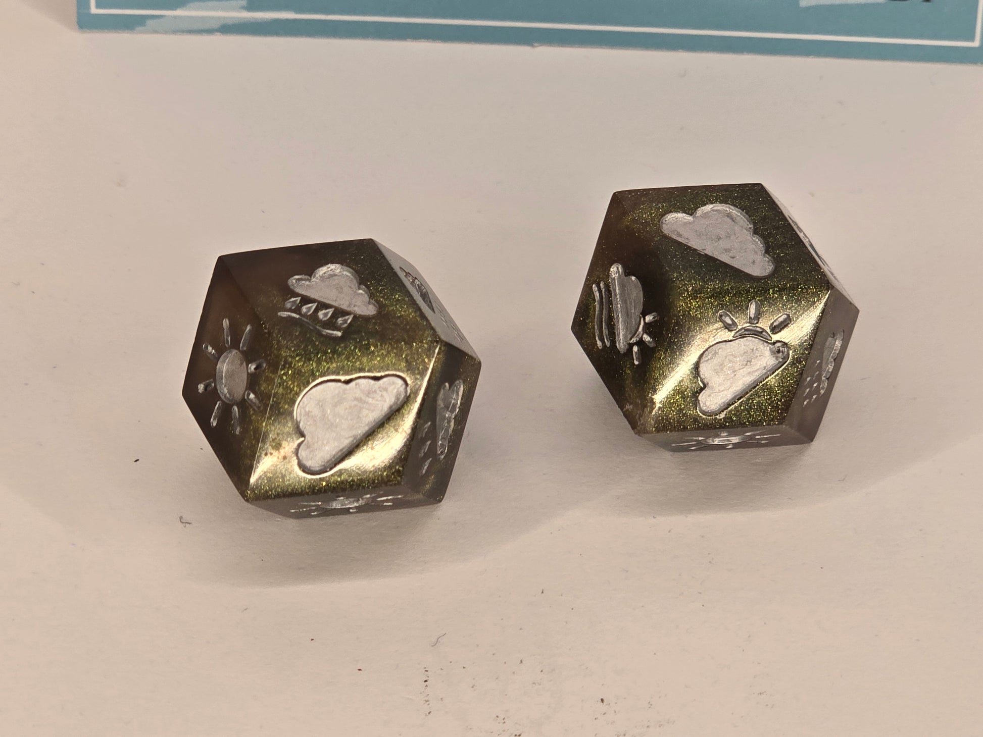Add a little sparkle to your gaming sessions with our Handmade weather dice! These D12s feature chromatic glitter swirled designs that are perfect for predicting the weather in your fantasy world. Roll in style and unleash the power of mother nature (no guarantees).