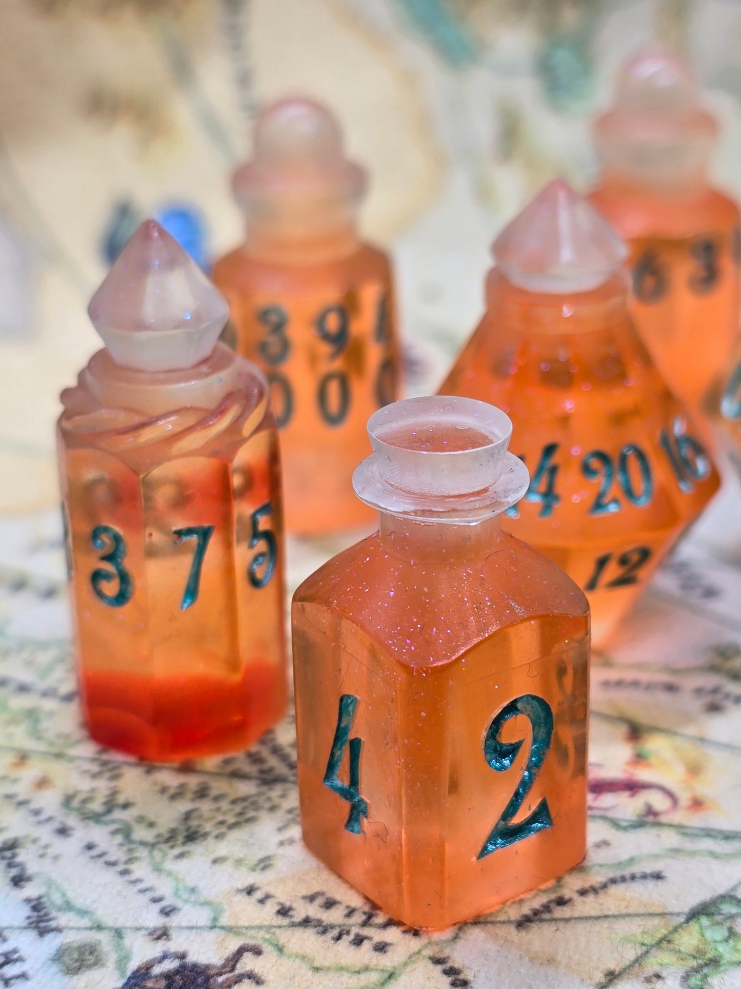 Unleash your inner magic with these handmade ice pops dice! This set includes 7 clear orange glittery pops, featuring quirky font and unique potion bottle shapes. A playful twist on the classic ice pop, perfect for indulging in some refreshing (and magical) fun!