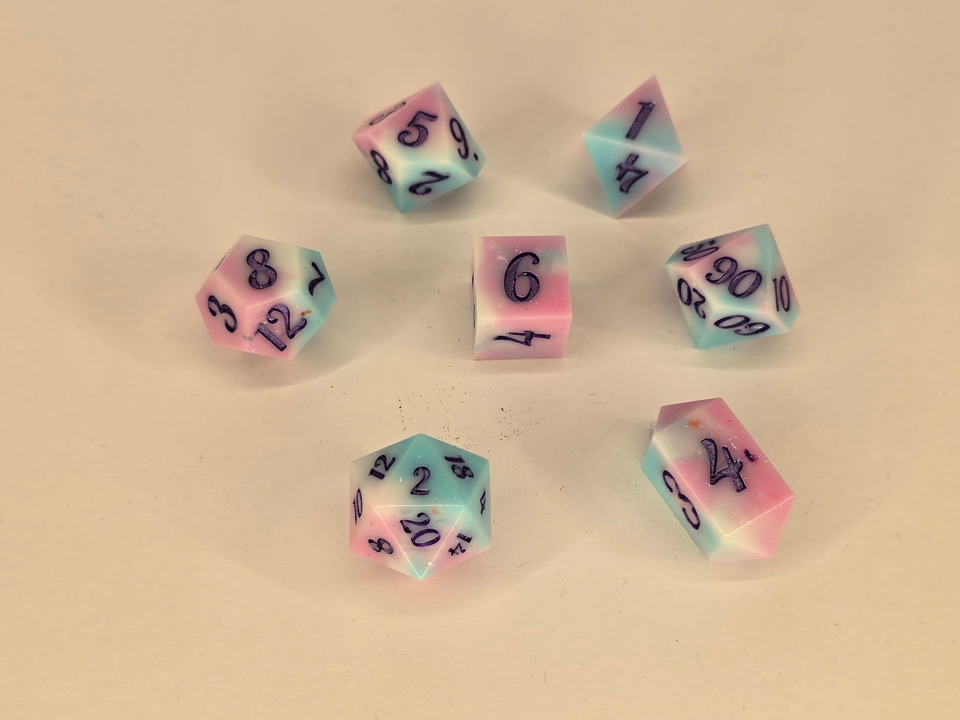 Roll with pride with our Trans pride handmade dice set! These colorful dice feature pastel tones, bringing a touch of whimsy to your game night. Show off your unique style and support the LGBTQ+ community with this one-of-a-kind set.